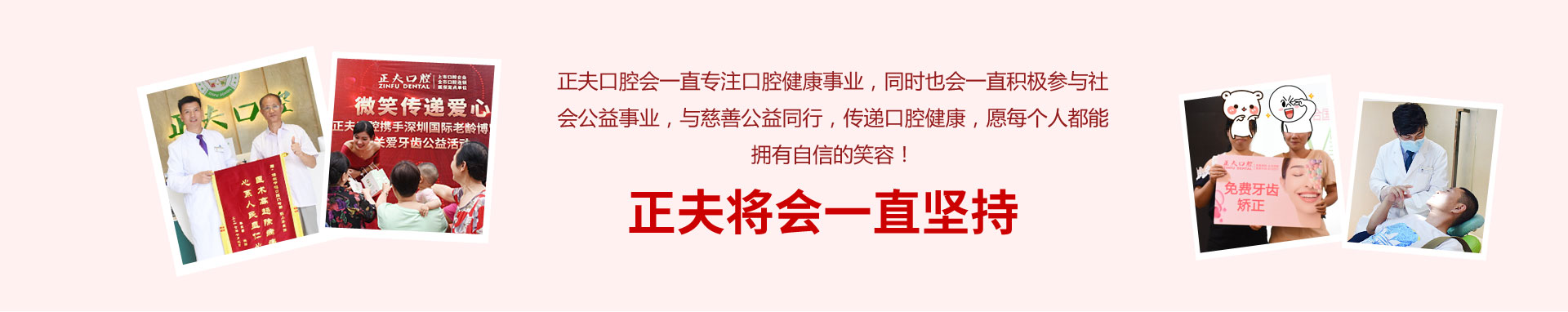 正夫口腔一直做公益事业的先锋,我们一直保持高度的社会责任感,时刻关注大众的口腔健康、一直以 精湛技术及一颗奉献的心推动慈善公益事业的发展。对于社会上的弱势群体 ,正夫口腔更是不遗余力地 给予关爱和帮助,力求让他们感受到爱和温暖。